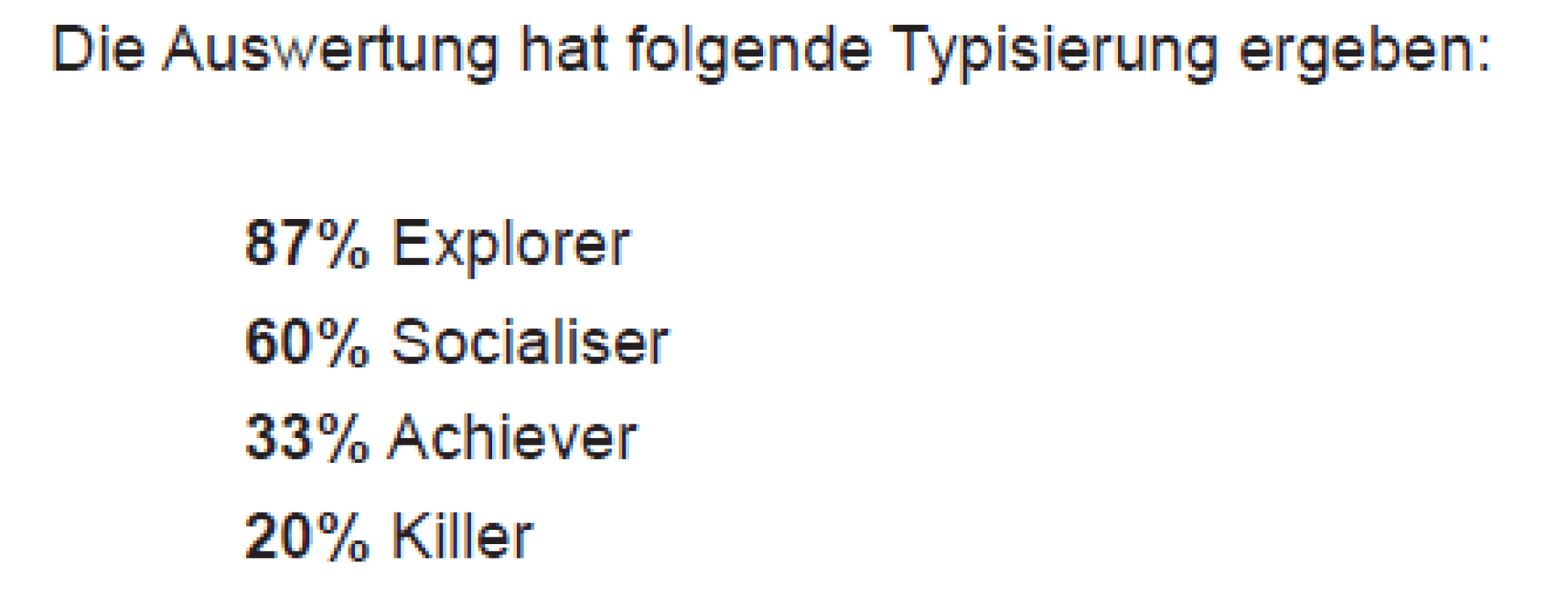 Die Befragten wurden mithilfe eines standardisierten Fragebogens in vier Gamertypes unterteilt: Killer (kompetitiv), Achiever (erfolgsorientiert), Socializer (community-fokussiert) und Explorer (immersion-getrieben).